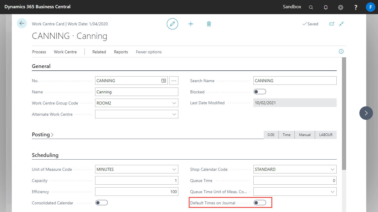 The Default Times on Journal option has been added to the Work Centre card which determines whether the times are defaulted from the Production Order setup for output journal lines.