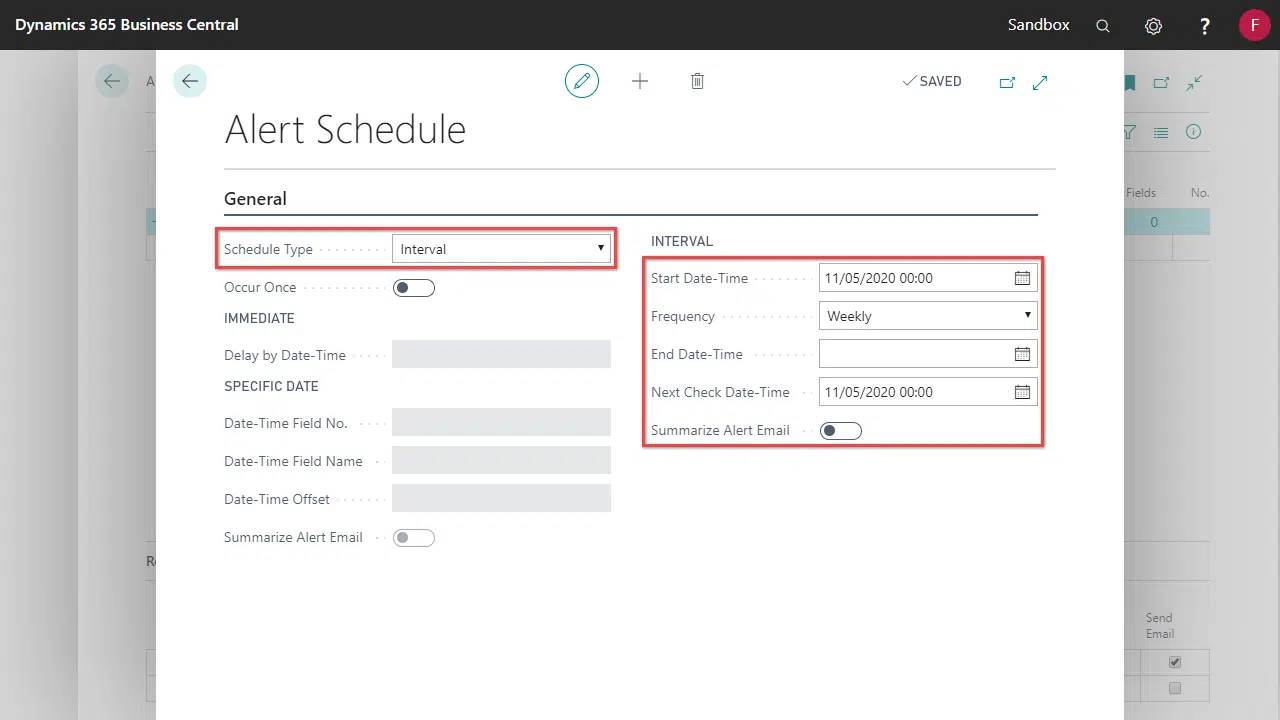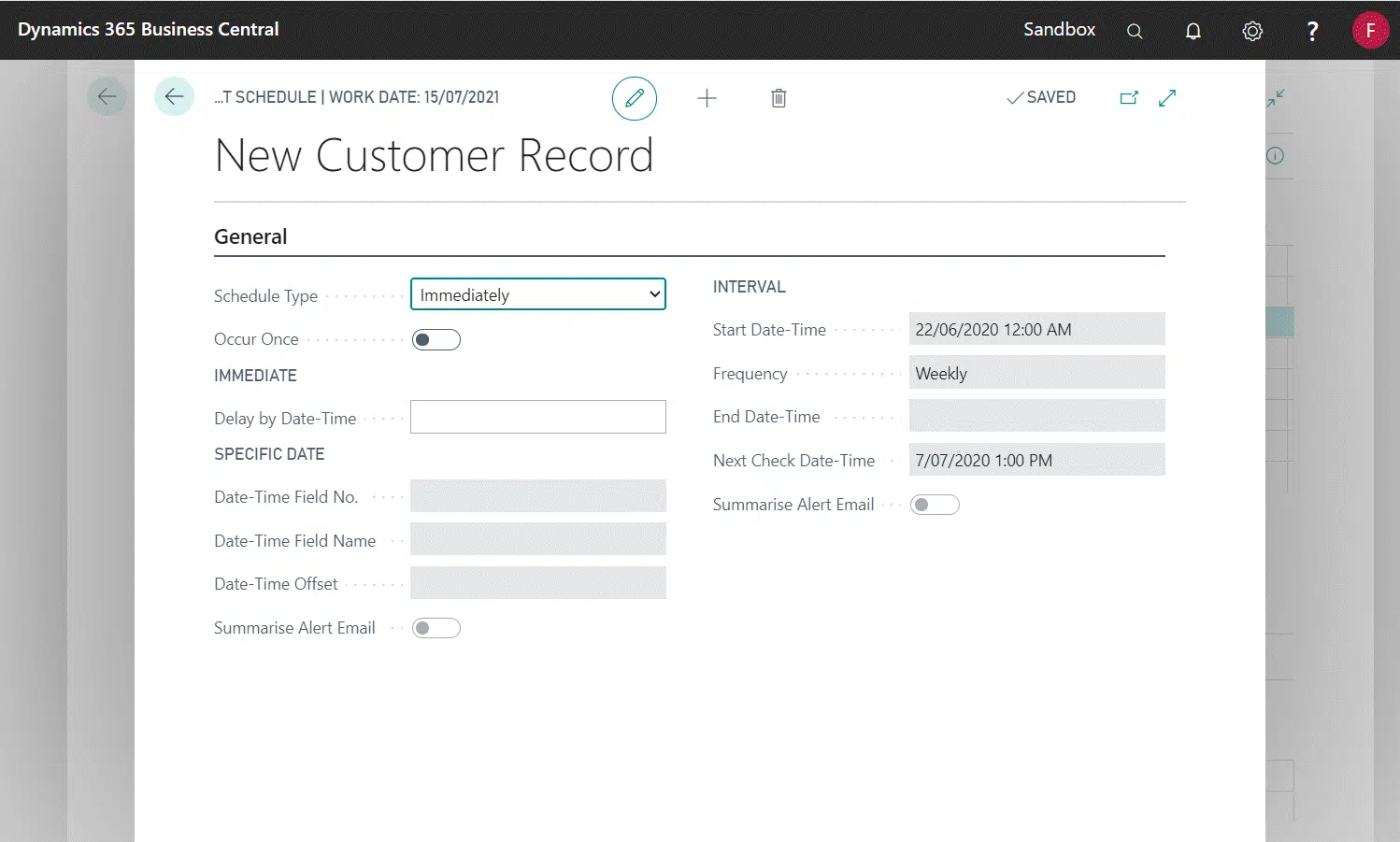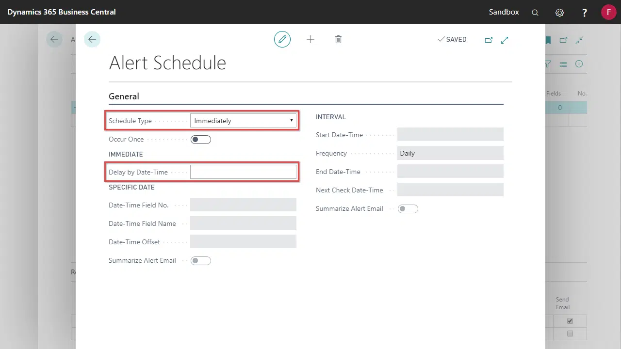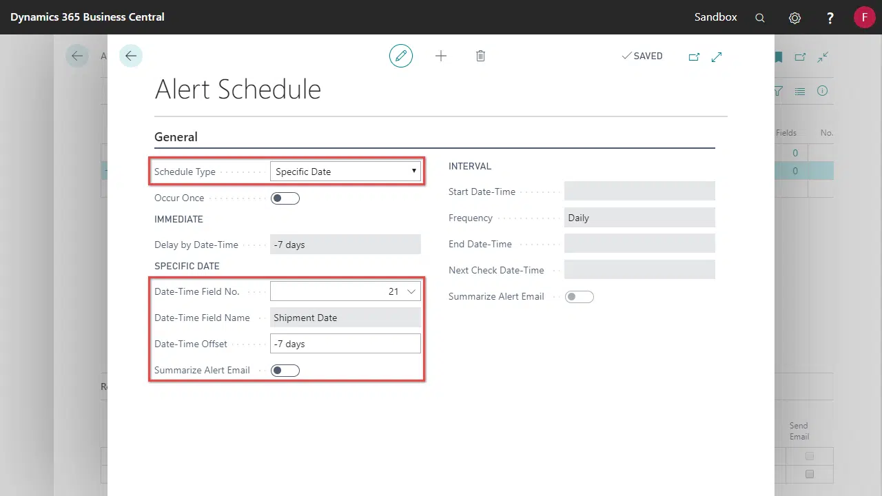 The Alert will be sent on a specific date based on a field from the Alert’s table. For example, this field can be the Requested Delivery Date on a Sales Order. You can also offset when the Alert is sent by a fixed time.