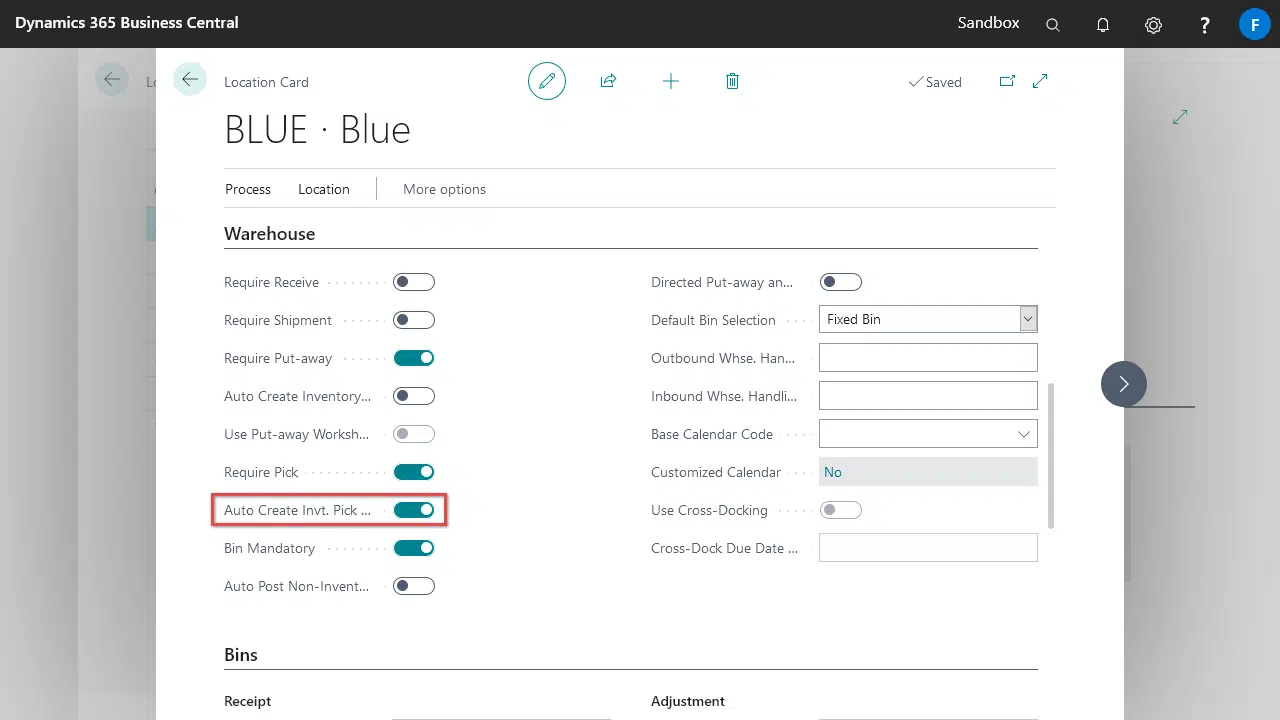 Navigate to the location where you would like inventory picks to be automatically created as stock is receipted at this location, and enable Auto Create Invt. Pick on Receipt
