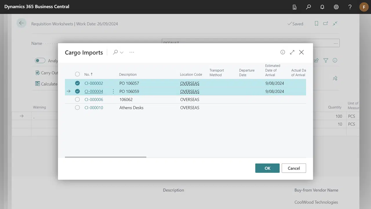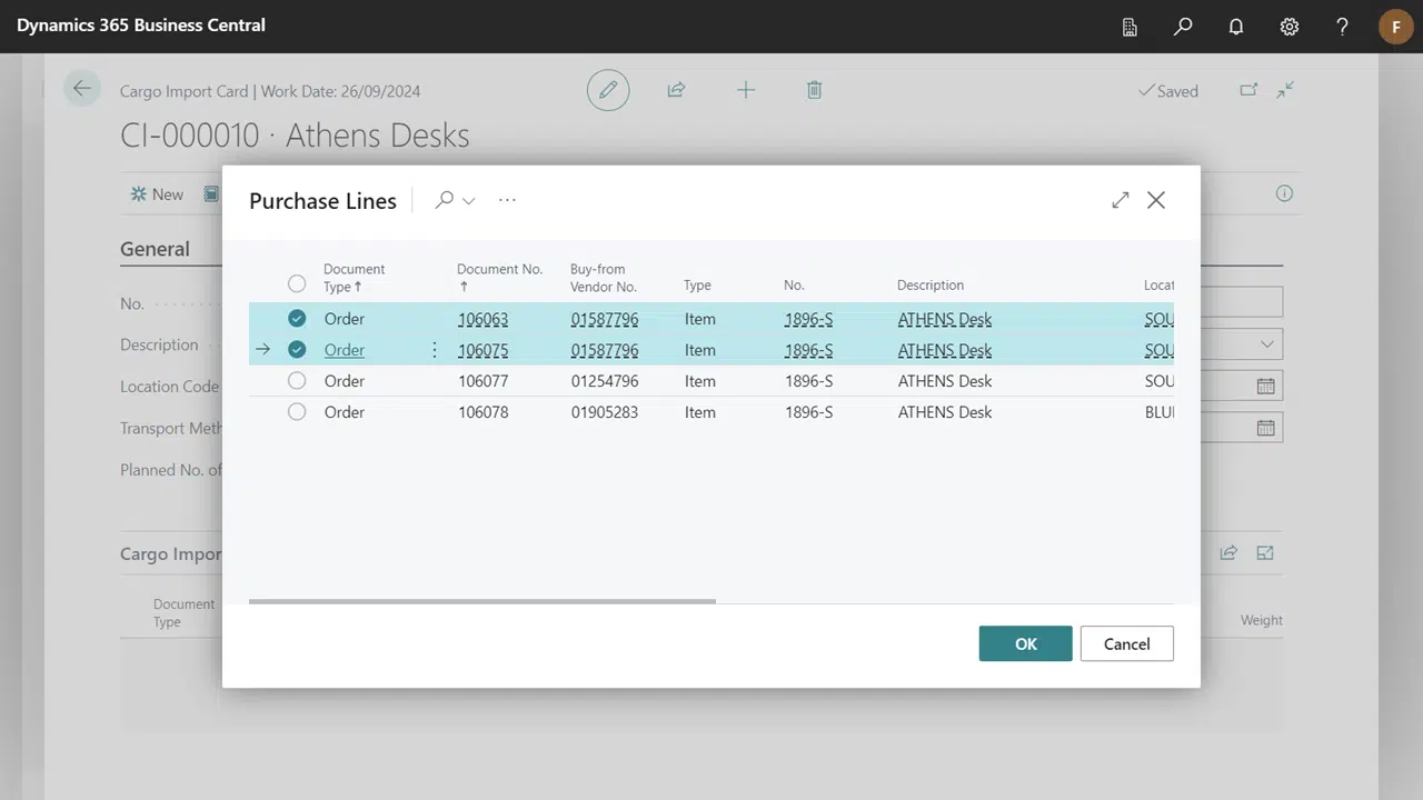 - Select the Purchase Orders you want to link to your Cargo Import.