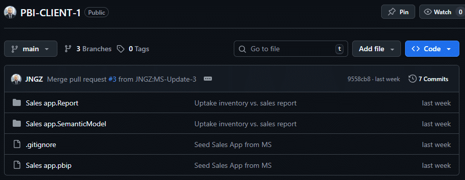 In this section, we’ll jump into a hands-on example. This isn’t the definitive guide to branching strategies but one that illustrates how to incorporate Microsoft updates with a client’s customised semantic model. You can access the fully worked example from this GitHub repo: JNGZ/PBI-CLIENT-1