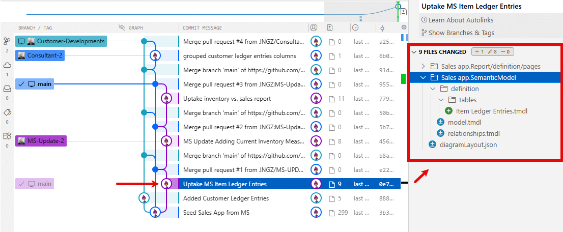 To integrate these changes with the customer’s model, begin by downloading the latest PBIX, converting it to a PBIP and committing it to a new branch called Uptake MS Item Ledger Entries. This is branching off the Main branch.