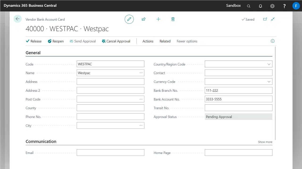 When the vendor’s bank account is under review, this account will be set to Pending Approval and blocked from all usages in Business Central until it is approved. This field has been added to the Vendor Bank Account Card and List pages.