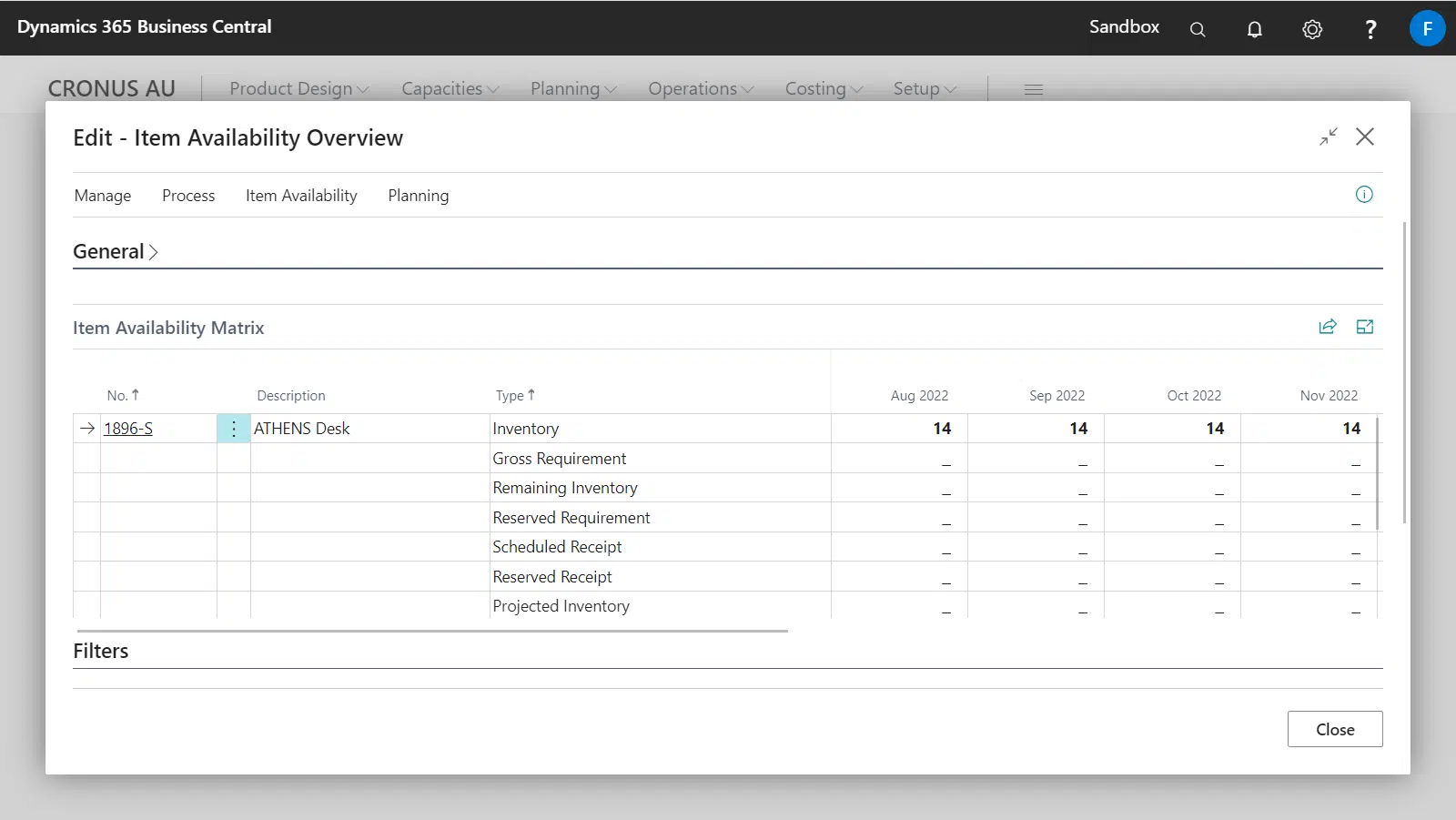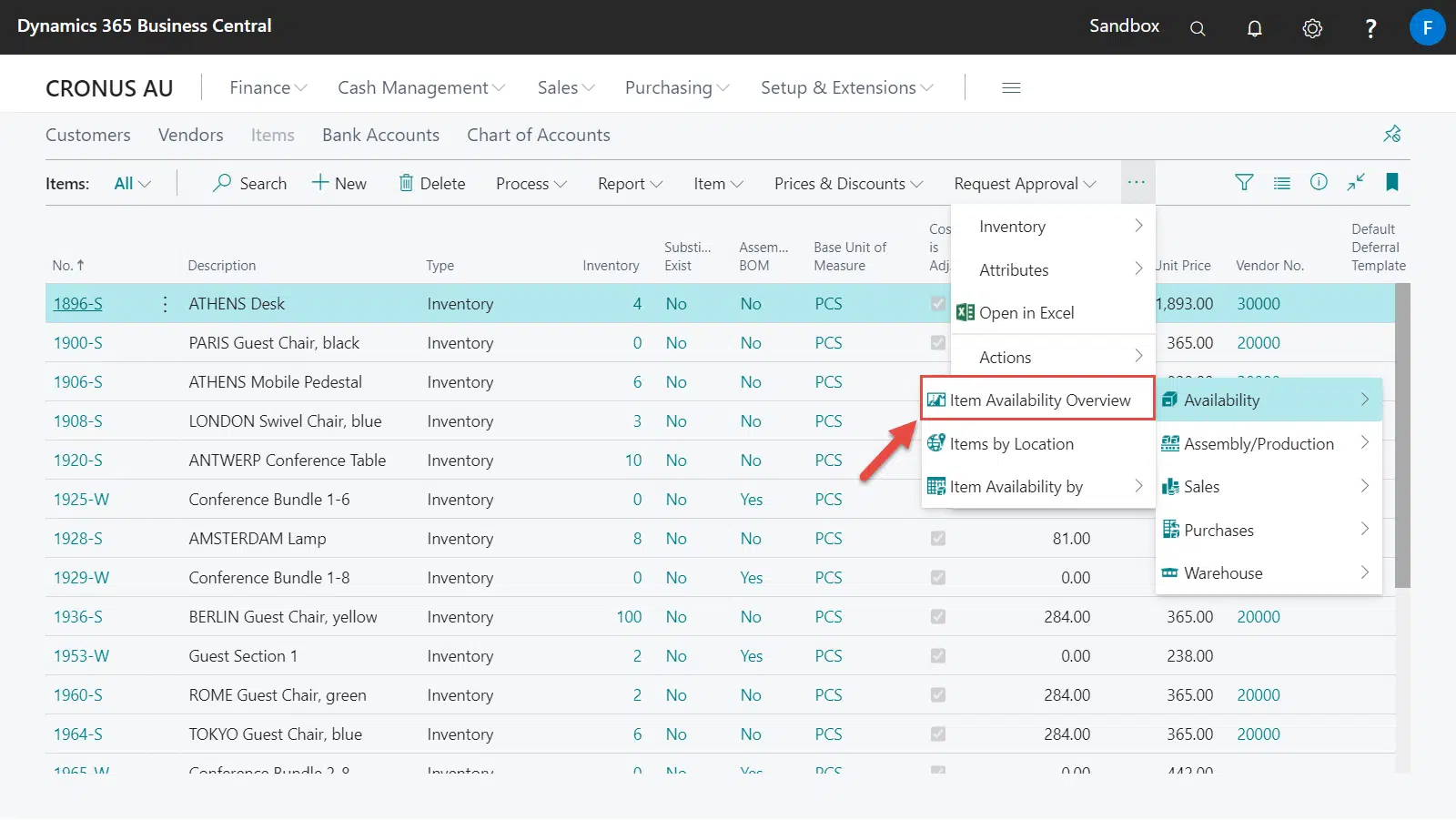 You can access the availability overview from various Role Centres and Pages, from the Item card choose Related > Availability > Item Availability Overview.