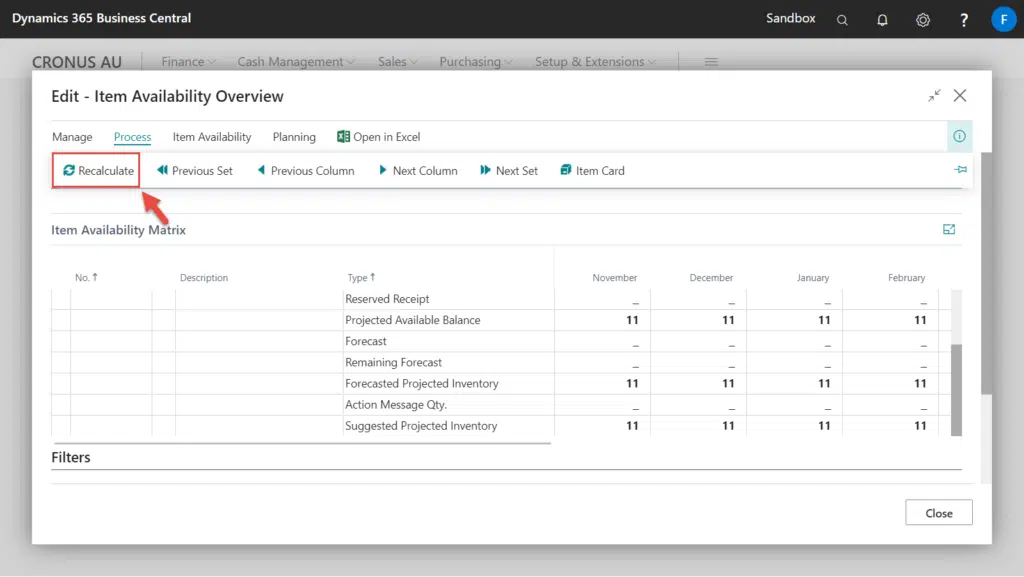 If the quantities on the Item Availability Matrix are outdated, you can refresh the matrix by choosing Process > Recalculate action from the Item Availability Overview page.