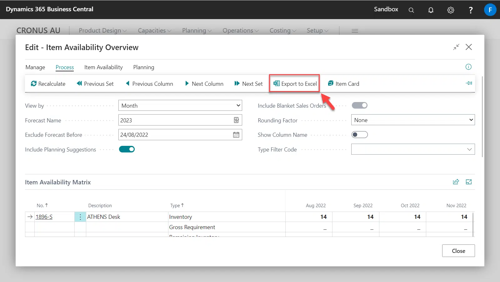 The entirety of the data displayed on the Item Availability Overview page can be exported to Excel. An excel spreadsheet will be downloaded that will hold the data displayed on this page.