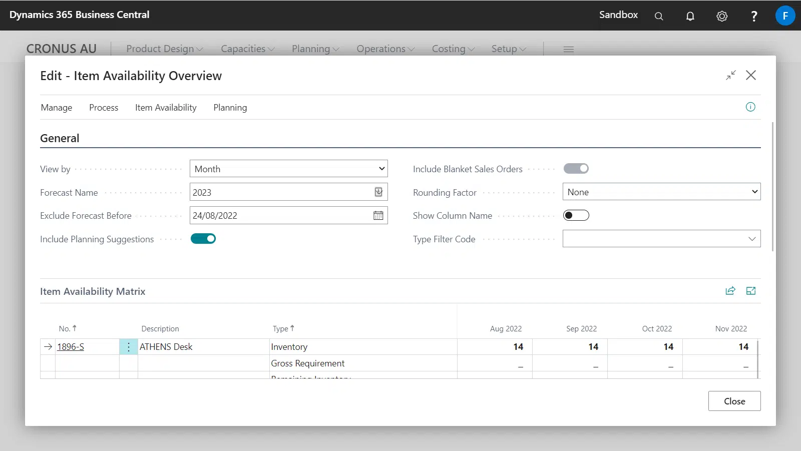 You can access the availability overview from various Role Centres and Pages, from the Item card choose Related > Availability > Item Availability Overview.