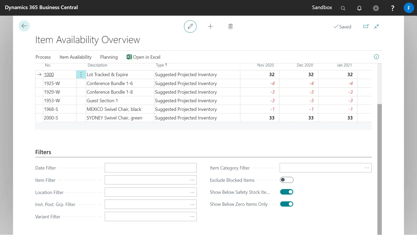 Forecasted Projected Inventory | Specifies the item’s inventory, including anticipated demand from demand forecasts or blanket sales orders. Yellow if below Safety Stock, Red and Italic if Below 0. |