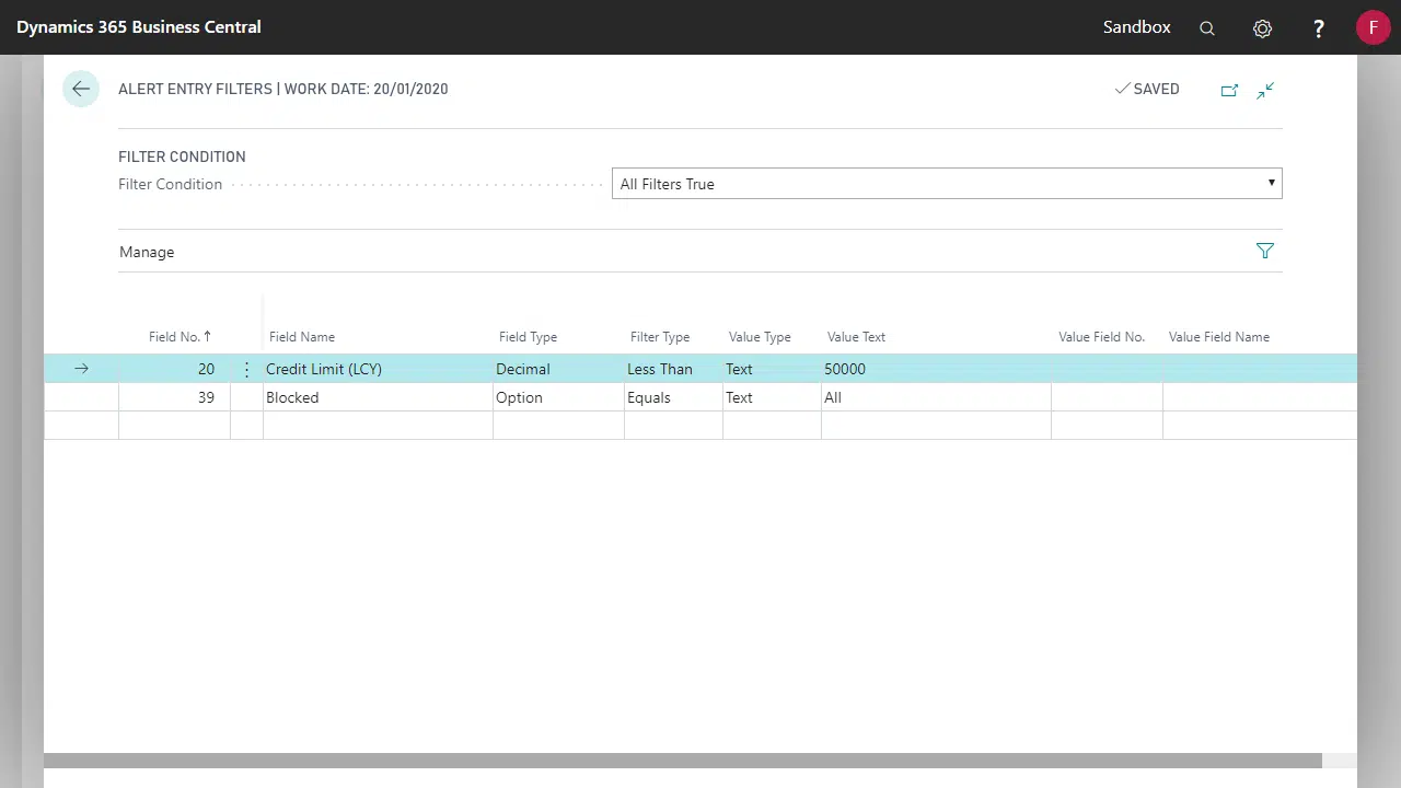 Setting filters on a specific Alert entry