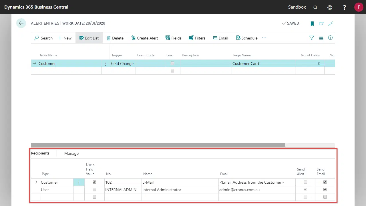 Alerts can be distributed to Business Central users by using details from Customer, Vendor, the triggered table, or directly to an email address.