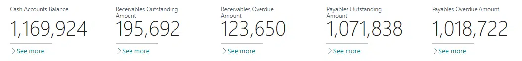The outstanding and overdue amounts are shown as Activities cues on the Finance role centre, allowing the accountants to drill down directly into the overview pages.