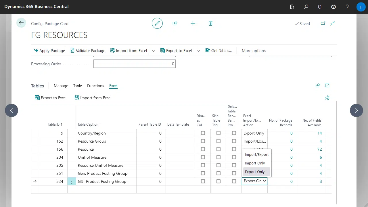 Sometimes you only want to export certain tables for referencing, or only import tables for adding new data, for this you can use the Excel Export/Import Action field on Configuration Package Tables. This is only available when exporting or importing using Excel.