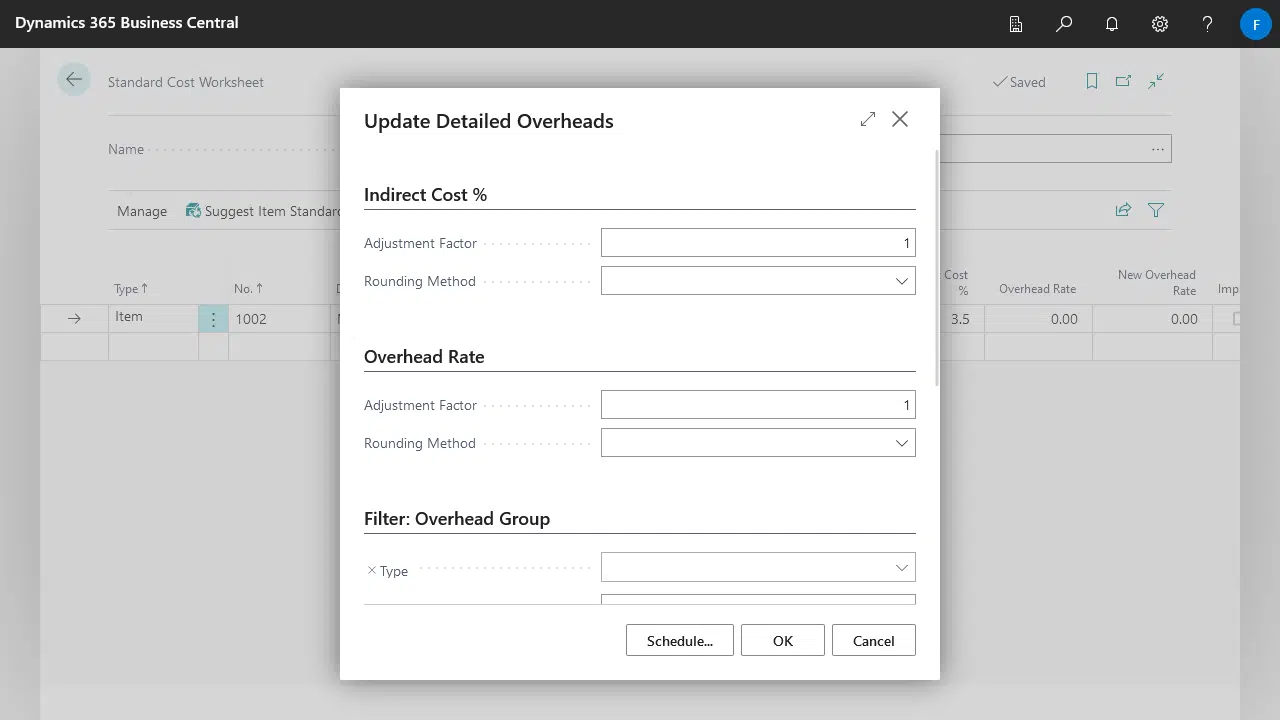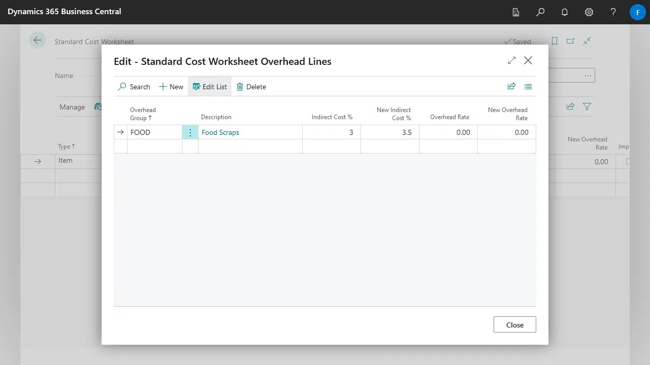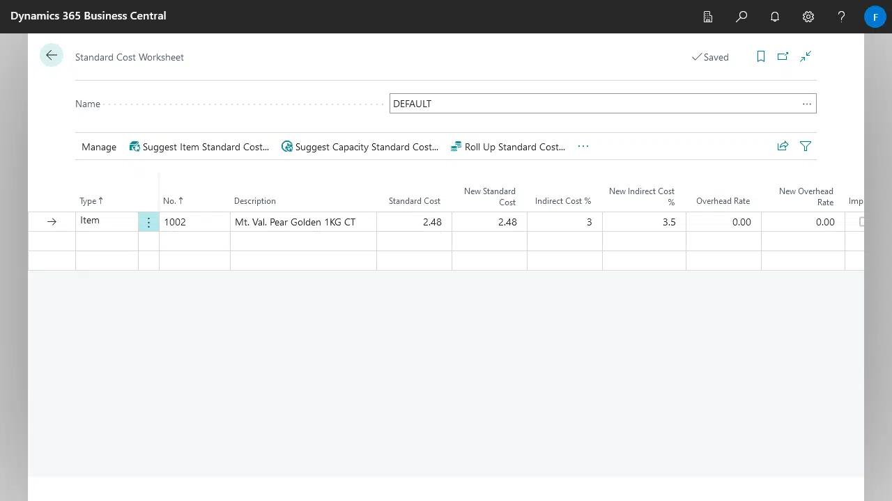 1. Create a new line on Standard Cost Worksheet for an Item, Work Centre, or Machine Centre. This can also be done via the standard Suggest… actions.