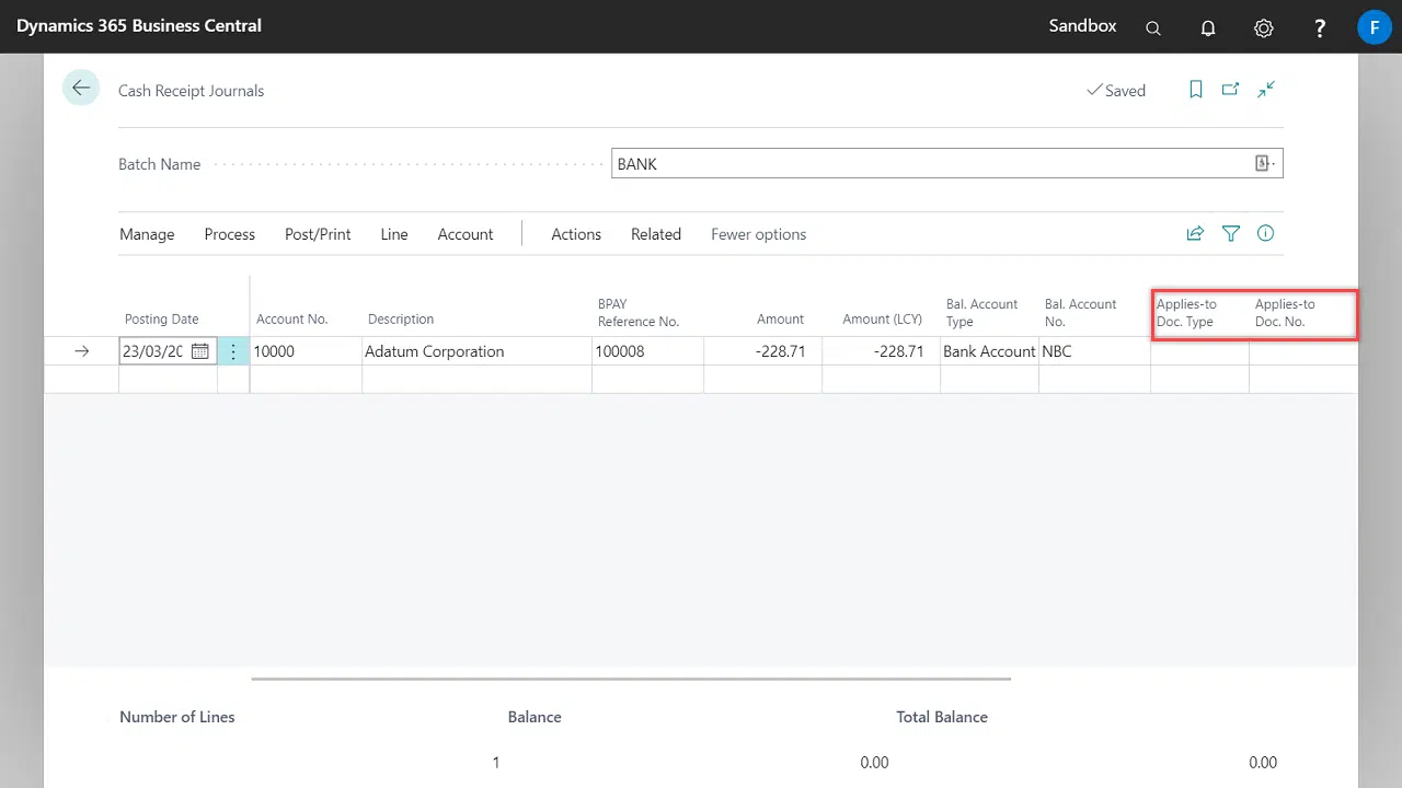 The BPAY Reference No. is linked to a specific document and these details are populated in the Applies-to Doc. Type and Applies-to Doc. No. fields.