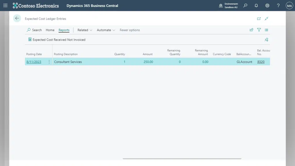 The Expected Cost Received Not Invoiced report is used to reconcile the expected cost postings.
