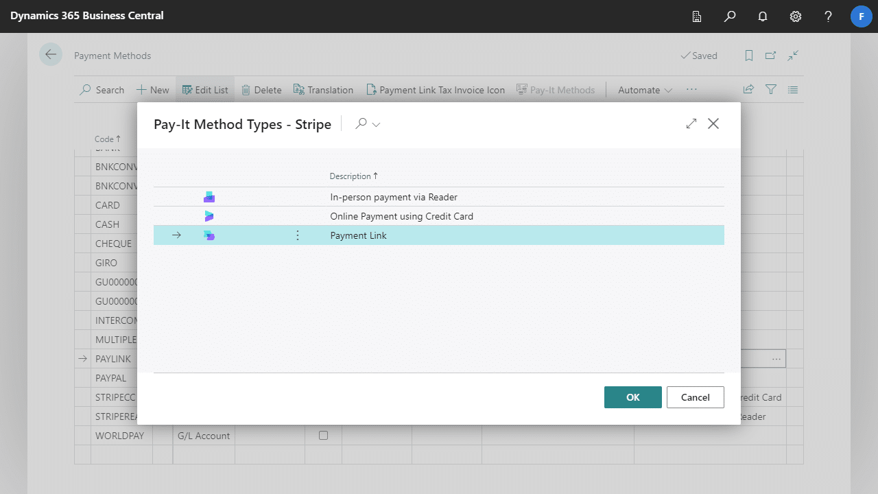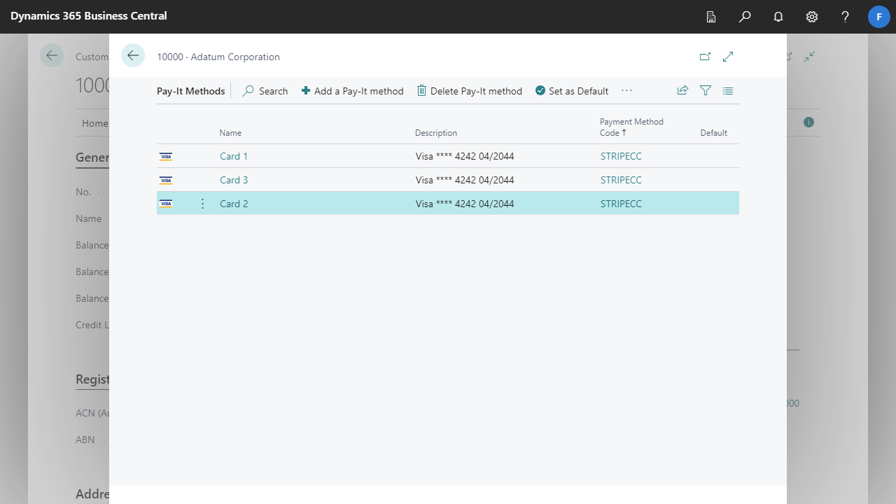 Manage saved customer cards against new or existing customers in Business Central using our Saved Pay-It Method list. During payment processing, simply select the payment method you wish to use, and no further actions are required.