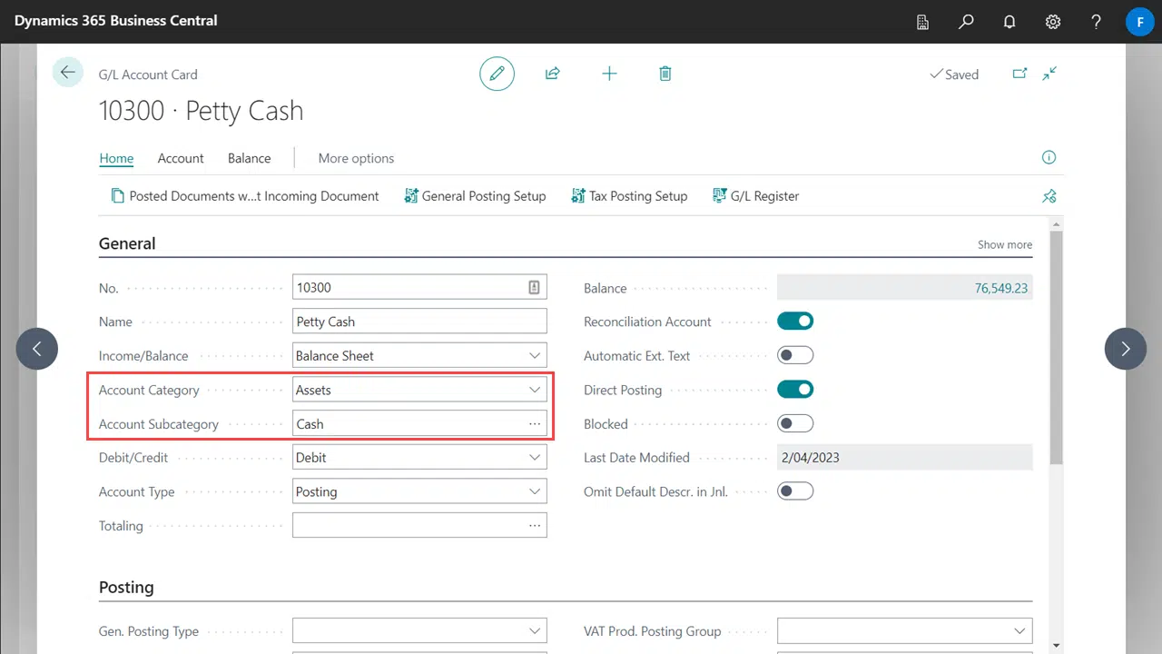 The Account Category and Account Subcategory can be assigned directly to the G/L Account via the G/L Account Card.