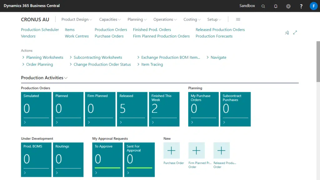 The app extends the Manufacturing Role Centre and can be found in the actions menu.
