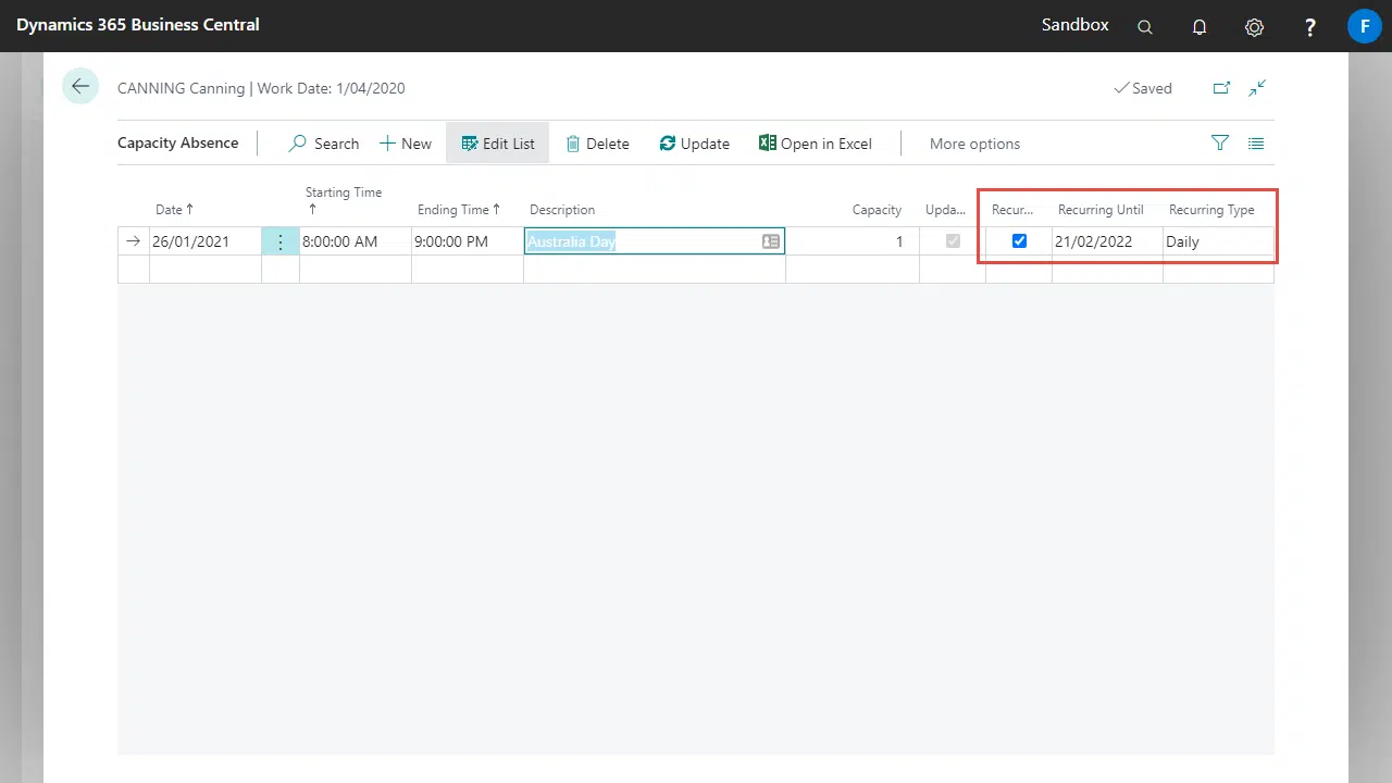 Recurring options have been added to the capacity absences page to allow for certain days on the year to be excluded from capacity planning. This can be used to take into account holidays, closures, or other public/bank holidays.